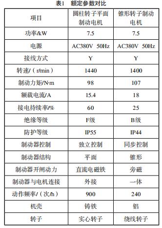 以功率7.5kW、極數(shù)4、轉(zhuǎn)速1440r/min的電機為例,圓柱轉(zhuǎn)子平面制動電機與錐形轉(zhuǎn)子制動電機的額定參數(shù)對比如表1所示。